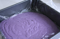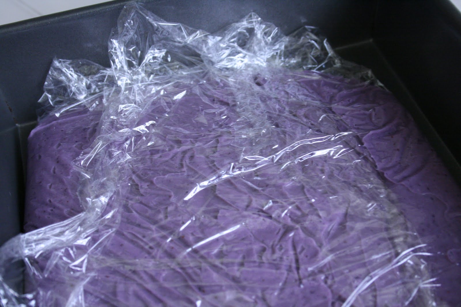 5. Then pour into a the plastic lined cake pan and cover with plastic wrap. *Freeze.